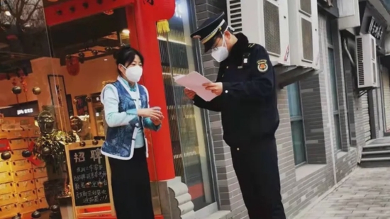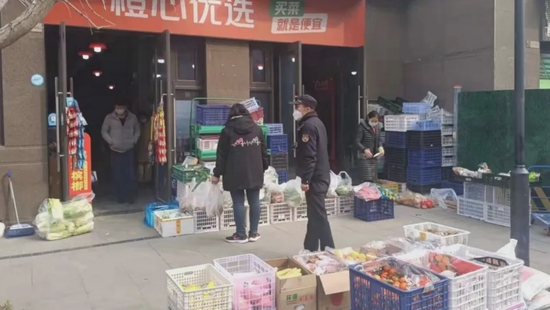 执法队员上门宣传,对辖区内超市、便利店、生鲜店等经营生活必需品的沿街门店,在不影响通行、不造成人员聚集的前提下,可利用门前区域出店经营,要求经营者合理安排出店品类,优化排队、选品、称重、打包、结算等环节,并做好门前环境卫生清理。