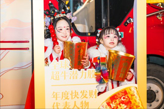 此外,在餐车旁边,肯德基还特别布置了“快发财”主题拍照点,吸引年轻游客、小朋友纷纷打卡。KFC是“Kuai Fa Cai”的首字母,简单明快的口号印在新春大金桶上,代表了肯德基对消费者的满满祝福。与家人一起来大明宫赏灯的刘女士说,“看灯会主要看的是气氛,大明宫灯组大气磅礴,还有肯德基餐车带来美食和视觉新体验,孩子玩儿得非常开心。”