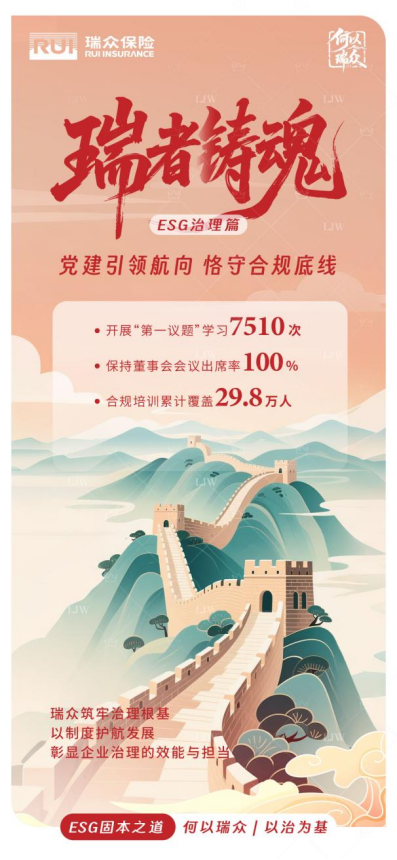 何以瑞众,是党建铸魂、众享共治的改革决心——瑞众保险全面深化改革,不断健全治理结构,筑牢发展根基,瑞泽经营之道,众享治理成果。2024年度,瑞众保险深入钻研二十大精神,全面加强党的领导,开展“第一议题”研究7510 次,专题党员培训超10000人次,反腐倡廉教育187场,发展党员518名;优化治理结构,董事会会议出席率100%,全年通过议案93项;坚守合规底线,增进全员合规意识,专题合规培训活动覆盖29.8万人。