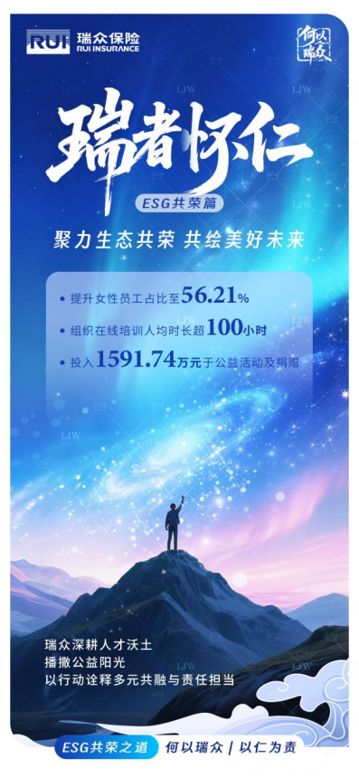 何以瑞众,是以人为本、共创未来的企业理念——瑞众保险坚持携手员工、代理人、合作伙伴打造保险命运共同体,共创发展机遇,共享发展成果,瑞泽事业伙伴,众享美好未来。公司全力保障员工权益,实现员工企业共同成长,践行“女性友好”,女性员工占比达56.21%;深切关心员工身心健康,以健康服务、重点帮扶、业余活动多管齐下,打造“幸福职场”;搭建事业平台,共谋发展宏图,员工在线培训人均时长超100小时;积极投身公益,公益活动及捐款达1591.73万元,公益保险捐赠保额76.38亿元。