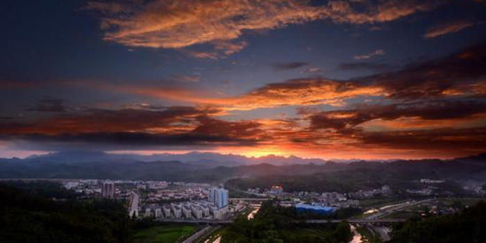 7月26日傍晚,陕西省宁强县西城现壮观的火烧云与平流雾。