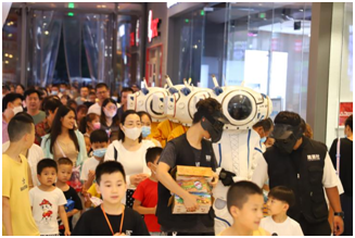 7月16日现场人气爆棚,热闹空前。元宇宙彩绘乐园、塔特星球奇妙游等众多活动都广泛受到顾客的喜爱。由塔特星球探索队闪亮登场,揭开了本次IP展的神秘面纱开端,现场更有奇趣泡泡秀引流造趣,晚间的电音趴更是一度炒热现场氛围,变形金刚们化身电音达人,现场配合音乐互动起舞,引得围观顾客连连拍照并加入互动。塔特星球光电巡游等,因为塔特星探索队的出现,现场的小朋友们兴趣加倍,纷纷加入巡游队伍中,沉浸式体验与机器人互动,与元宇宙外星人共同行动的快感。