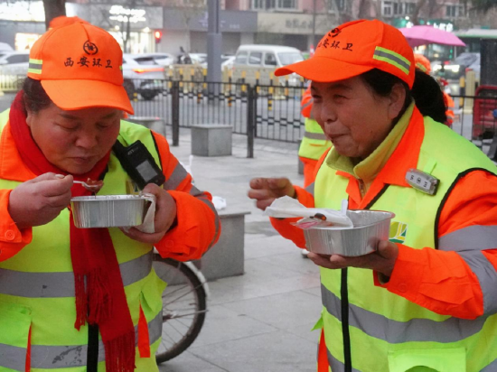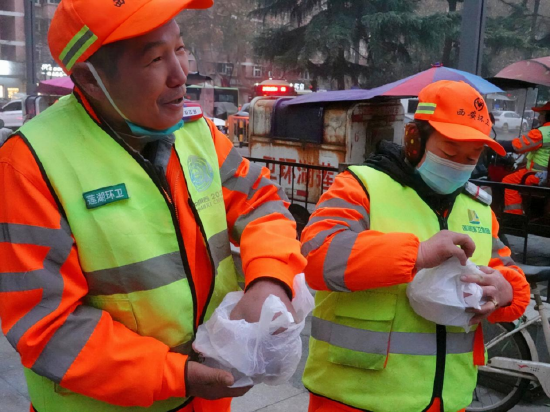 环卫工人王西宁:感谢爱心企业对环卫工人的呵护和照顾,今天腊八节虽然很冷,喝了腊八粥心里是热乎乎的。