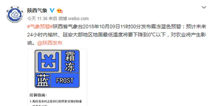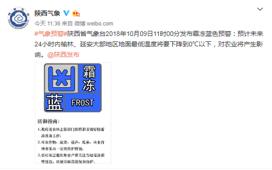 陕西发布霜冻蓝色预警 榆林延安地面最低温将至零下