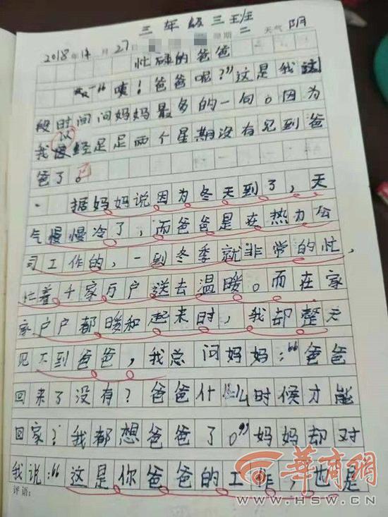 华商报讯(记者 李琳)“同事孩子的作文,看得我热泪盈眶。”这两天,一篇西安市三年级小学生的作文《忙碌的爸爸》在朋友圈里热传,文中写到:“我已经两个星期没见到爸爸了。”他爸爸忙碌的工作,和千家万户密切相关。