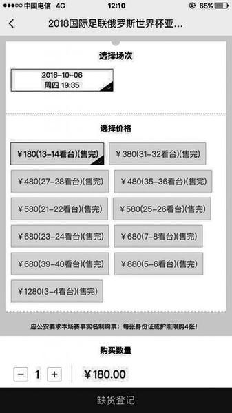 而为了感受抢票的火爆程度,本报记者昨天中午加入到了抢票的大军之中,12点前记者就按照要求完成了注册,并且在“高人”的提点之下提前填写了邮寄地址,11点58分记者开始不停地刷新页面,12点一到准时点击抢票,但180元已呈现售完状态,为此记者选择了四张380元的球票,随后按照操作快速输入姓名与身份证号,但遗憾的是页面显示已经售完。按照步骤记者又分别选择了480元和580元的球票,不过最终都没成功,12点10分记者看到所有价格区间的球票都已经售完。
