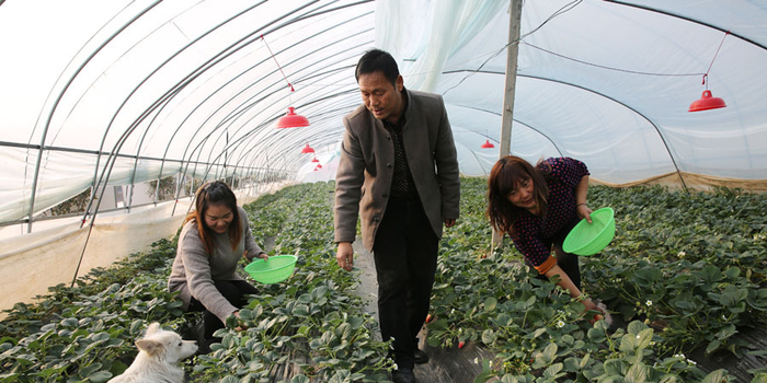 90后农场主王江玲和父母在自己的家庭农场里采摘深冬草莓。
