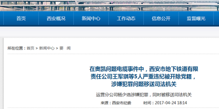 西安地铁西安质监多人因奥凯电缆事件被开除党籍