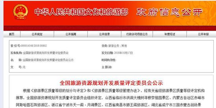 国家文化和旅游部官方网站发布全国旅游资源规划开发质量评定委员会公示。
