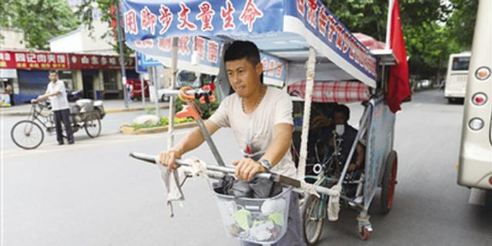 冯树仪拉着残疾叔叔一路走来看看风景,并帮叔叔圆梦。 本报记者 李宗华 摄
