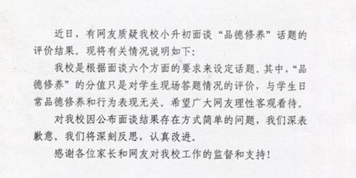 近日,有网友质疑我校小升初面谈“品德修养”话题的评价结果。现将有关情况说明如下: