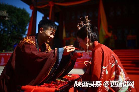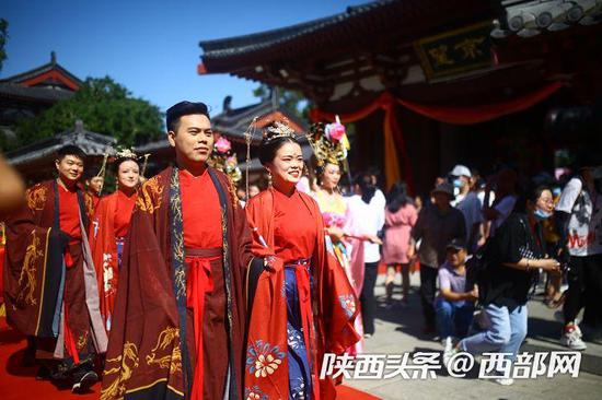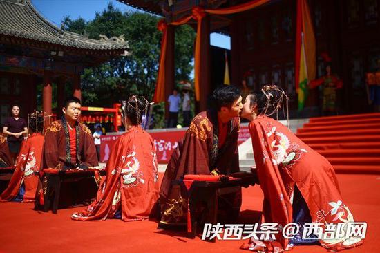 活动当日,来自西安交通大学第二附属医院、陕西出入境边防检查总站的7对抗疫英雄亲历华清宫七夕唐宫婚典,体验大唐风韵的迎宾礼,游览风光旖旎的皇家园林。根据传统唐代婚俗,情侣们携手跨火盆、过马鞍、结发同心、行同牢礼、拜天地,在唐宫婚典中感受幸福、盟誓三生。
