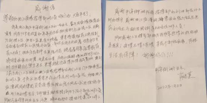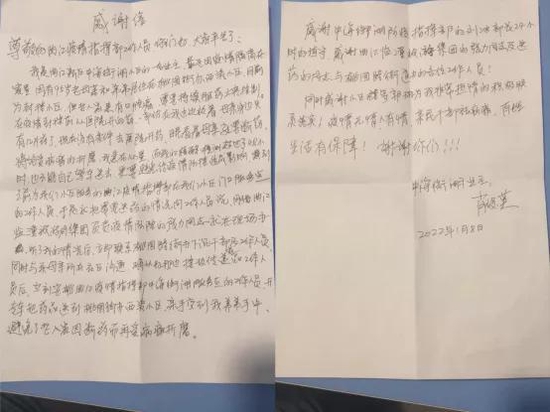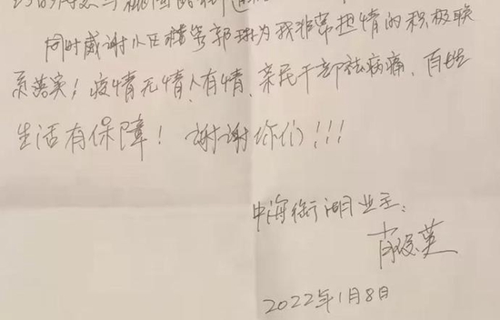 不久后,市民专程来到小区门口的疫情防控工作组道谢,临走前留下了这封感谢信,上面写道:“疫情无情人有情,亲民干部祛病痛,百姓生活有保障”。纸短情长,一封简单的感谢信,字里行间写满了业主朋友对疫情防控工作人员的感谢与信任,也给了我们身在一线的抗疫志愿者们莫大的鼓励。