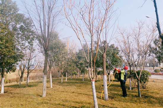 为有效减少病虫害发生,工作人员对灞河两岸苗木、区内道路行道树、休闲广场、公园等绿化景观进行全面喷药除虫,剪除病虫枝,有效控制病虫害的蔓延,确保绿化植物生长态势良好。