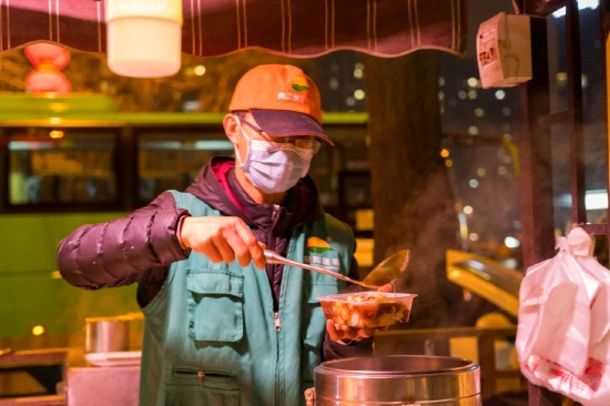 宵夜常客的花甲米线、鸡蛋灌饼、杂粮煎饼,人气小吃烤鱿鱼,烤冷面、烤苕皮臭豆腐,地道西安美食的杂肝汤、豆腐烩菜泡馍、养生麦饭……空气中弥漫着浓浓的美食气味,肉夹馍、土豆片夹馍摊位前排起了长队,人间烟火气在每个摊位上滚烫扑腾,呈现浓浓的冬日滋味。
