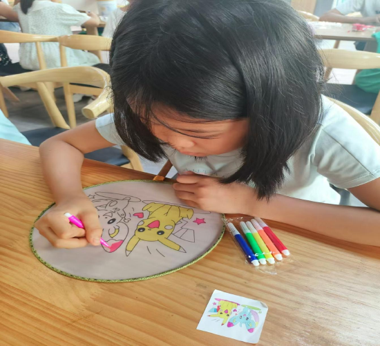 值得一提的是,整场活动孩子们热情高涨、专心致志,勾勒、上色,灵动鲜活的画面跃然绢上,一幅幅或典雅、或富有童趣的扇子精美呈现,让原本单调的扇面开始变得缤纷多彩,每一个团扇上都染上了属于孩子们独有的个性色彩。经过一个小时的精心创作,一把把融入了中国传统文化意境美、诗意美以及美好祝福的团扇便制作而成,孩子们纷纷拿起自己亲手制作的团扇争相合影,不时将活动氛围推向高潮。