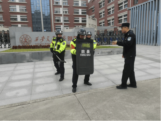 联防联控聚合力,实战演练强本领。曲江派出所民警走进辖区阳光幼儿园、交大附中,以“检查+演练”模式筑牢校园安防网。期间,民警对门禁管理、安防器材、监控系统、消防设施开展全维度排查,确保一键报警畅通、制度落地见效。现场,为安保人员与教职工开展防暴器械实操培训,详解钢叉、盾牌等装备的操作要领与协作战术。