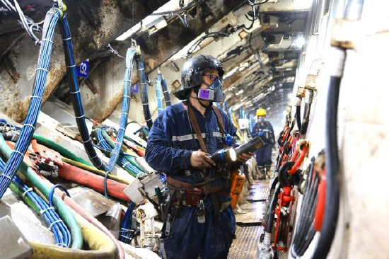 图为综采五队员工在狭小作业空间中搬运检修需要配件