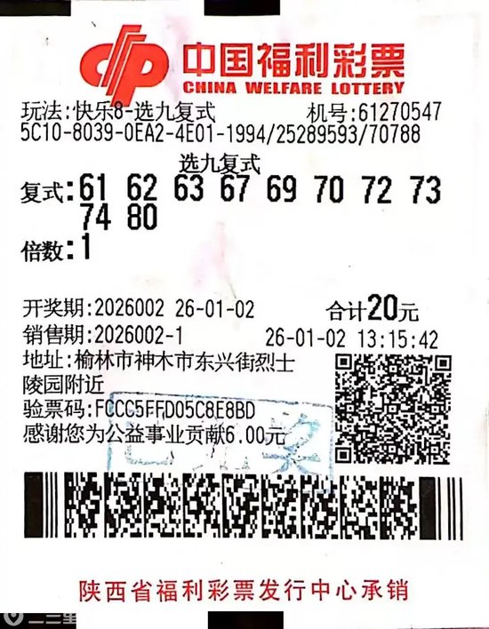 据悉,中奖彩票开奖当天13时15分售出于神木市东兴街烈士陵园附近福彩第61270547号投注站,流水号为1。该票为一张10码选九复式守号投注,命中9个开奖号码,中得“选九中九”1注及“选九中八”9注,总奖金26.8万元。此次大奖也成为榆林彩市在2026年迎来的“开门红”。