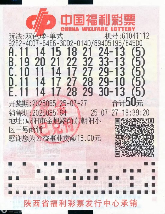 双色球2025年度陕西福彩单人单期最高奖,出在咸阳。