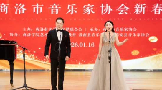 1月16日晚,商州西路秦韵教育城报告厅灯火璀璨、乐声悠扬,“乐韵颂丹江同心迎新春”2026年商洛市音乐家协会新春音乐会在此精彩上演。本场音乐会由商洛市文学艺术界联合会主办、商洛市音乐家协会承办,商洛学院艺术学院、秦韵教育、洛南县音乐家协会、镇安县音乐家协会等多家单位协办,汇聚了商洛市优秀音乐人才与艺术团体,为现场观众献上了一场兼具专业水准、民族风情与新春温情的高水准视听盛宴。