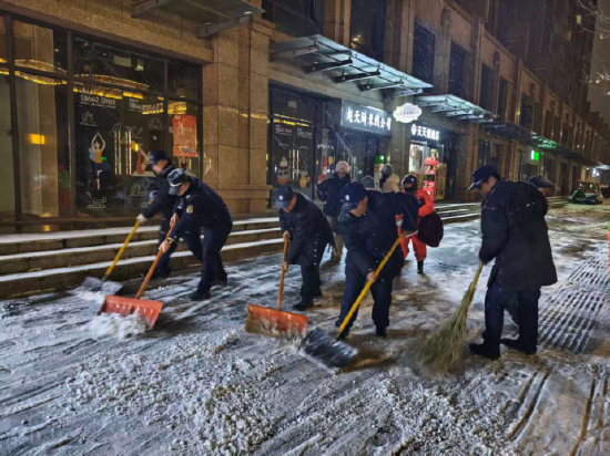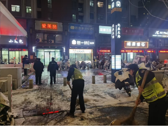 降雪后,浐灞国际港立即启动应急预案,对园区道路、桥梁坡道等易结冰重点路段,采取“机械为主、人力辅助”精准化清雪策略。在保障主干道畅通的同时,园区将工作重心向市民出行“最后一米”延伸,重点对学校周边、公交地铁站点、人行天桥、背街小巷及医院、商超、农贸市场等人员密集区域开展精细化清理,通过机械协同、人工清扫、专人值守的方式,全力保障人行通道畅通,确保市民步行安全。此外,城管局执法人员持续加强巡查督导,指导商户自查户外广告和招牌设施安全,及时清理牌匾积雪,严防安全隐患。
