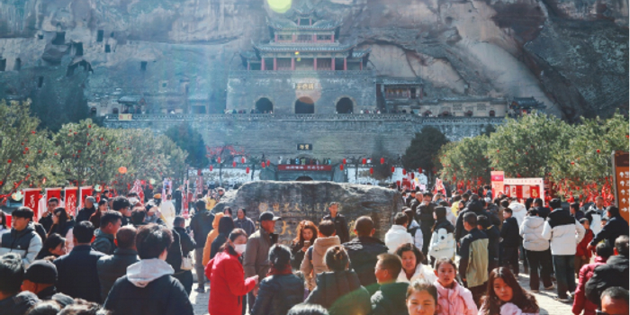 大年初一的彬州大佛寺,处处洋溢着新春的喜庆氛围,八方游客聚此祈福纳祥,红岩峭壁间的百余洞窟、近两千尊造像庄严肃穆,成为马年新春祈福圣地。