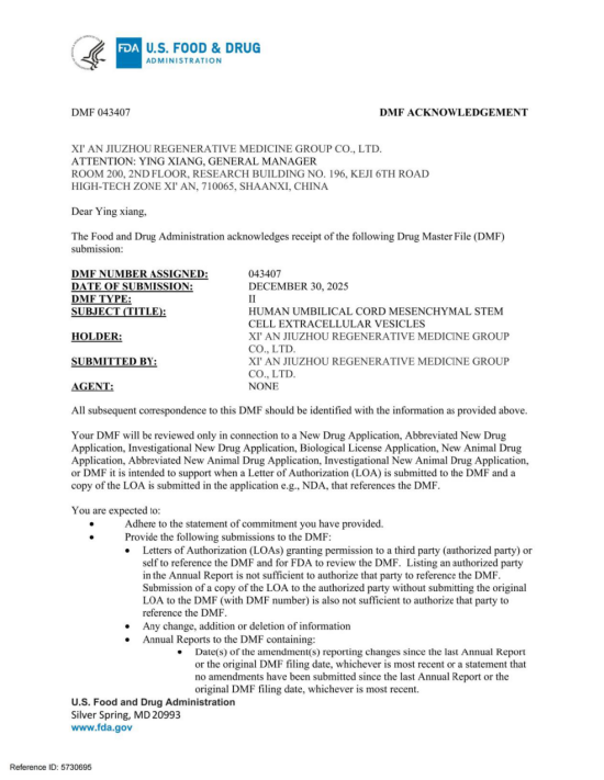 西高新企业外泌体原料通过美国FDA DMF与INCI双备案