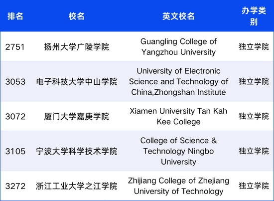以下5所独立学院进入武书连世界大学综合实力排名榜单。