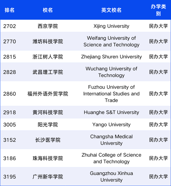 以下10所民办大学进入武书连世界大学综合实力排名榜单。