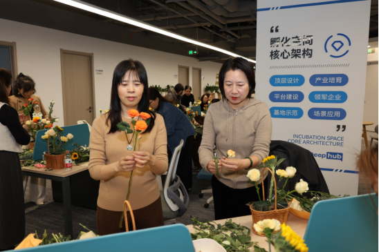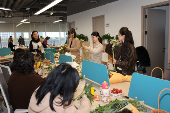 插花互动环节为活动画上圆满句号。花艺老师现场传授花材搭配、造型设计技巧,女同胞们相互协作、巧手翻飞,修剪花枝、错落布局,将对生活的热爱与对美好的期许融入指尖创作。不一会儿,一束束造型雅致、生机盎然的花艺作品相继完成,大家手捧作品合影留念,娇艳的鲜花映衬着灿烂的笑容,在花香与欢笑中定格下节日最美瞬间。