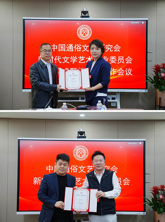 随后举行聘任仪式。李楠为专委会主任许喜林,常务副主任兼秘书长高海力,副主任委员侯韶图、孙荣、邵顺文颁发聘书。徐平贵为专委会高级顾问陈强、赵雄伟,以及副秘书长刘广智、张玲玲、李凤颁发聘书。受聘同志纷纷表示,将不负重托、履职尽责,为新时代文艺事业贡献力量。