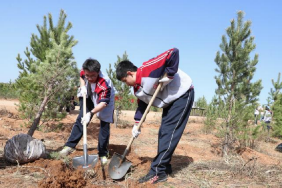 除了神东员工,神木市实验中学的学生志愿者们也为植树现场注入了一股青春活力。一名学生志愿者脸上带着汗珠,却难掩兴奋之情:“这是我第二次参加这么大规模的植树活动,虽然有点累,但看着亲手栽种的树苗扎根大地,感觉特别有意义,以后我要经常来看看它们长得怎么样。”