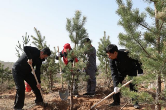 经过一天的辛勤劳作,新栽种的15000余株樟子松迎风挺立、错落成行,深深扎根于矿区沃土,在春日暖阳中舒展枝叶。