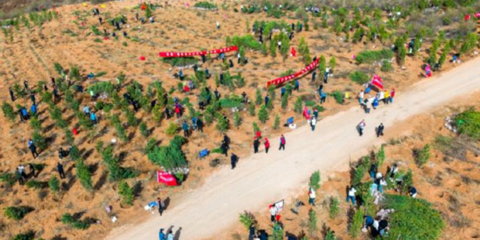 神东员工和大柳塔镇党政机关及驻镇单位、神木市实验中学等约1500人参加此次义务植树活动,企地人员携手挥锹播绿,为矿区添新颜。