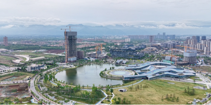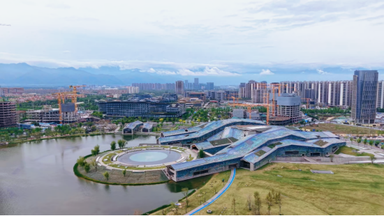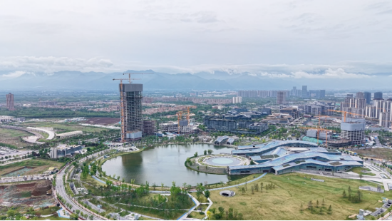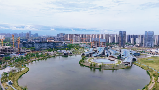 镜头下的未来之瞳片区,城市地标与自然盛景相映成趣。澄澈的瞳湖水面如镜,将层叠云影与远山风光尽数收纳;在建楼宇拔节生长,科创园区错落有致,在湿润的空气中尽显新城活力。