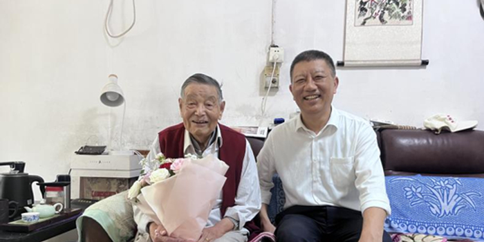 党委书记刘予东慰问退休教师许新安(右)
