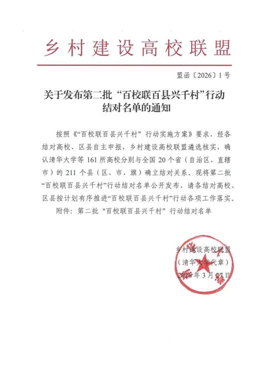 关注3月27日,由清华大学乡村建设研究院牵头的乡村建设高校联盟正式发布第二批“百校联百县兴千村”行动结对名单。经各结对高校、区县自主申报,联盟严格遴选核实,最终确认清华大学等161所高校与全国20个省(自治区、直辖市)的211个县(区、市、旗)确立结对关系,西安培华学院成功入选,成为陕西省同类院校参与该行动的典型代表,这是对学校深耕乡村振兴校地合作、扎实开展帮扶工作成效的国家级认可,也是学校践行教育部“双优工程”建设目标的重要阶段性成果。