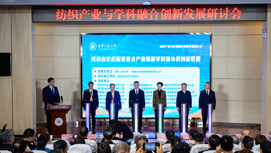 纺织产业与学科融合创新发展研讨会上,陕西省纺织服装重点产业链和学科链协同创新联盟正式成立。李晓英、孙瑞哲、陕西省工信厅副厅长朱磊、徐卫林、张志昌、陕西元丰新材料科技有限公司董事长李世雄一同为联盟揭幕。联盟的成立标志着陕西纺织服装产业迈入资源整合、协同共进的新阶段,将为区域经济高质量发展提供有力支撑。