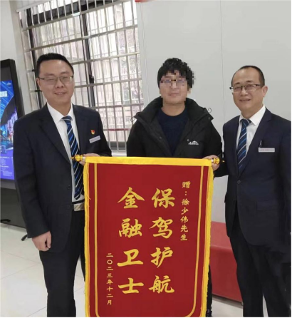 关注12月14日上午,西安迎来一场强降温,客户周先生冒着严寒,手持一面“金融卫士 保驾护航”的锦旗来到工商银行沣东分行和平工业园支行,把锦旗郑重地送到大堂经理徐少伟手里。