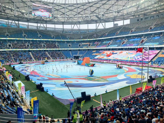 开幕式上,伴随着千余名青少年热情洋溢的舞蹈,各国参赛队伍依次入场,运动员与现场观众频频招手致意,观众席欢呼声与掌声雷动。随后的文艺展演环节,国乐演奏、武术表演展现了中华文化历久弥新的独特韵味,花式颠球和舞蹈表演展现了青少年的蓬勃朝气,南非世界杯主题曲《Waka Waka》欢快的节奏旋律将现场热情推向高潮。