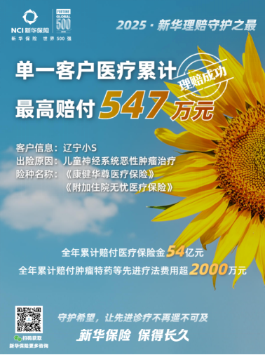 每一次赔付都兑现着医疗保险的价值,在疾病与意外面前,让每一次医疗选择,都只关乎生命,不囿于金钱。未来,新华保险将继续以专业、温暖的服务,守护每一位客户的健康之路,陪伴每一个有需要的家庭跨越生命的难关,让希望永在前方。