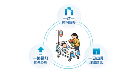 - 一对一慰问协办:理赔人员上门慰问并协助收集理赔材料,让客户免于奔波,专注治疗;