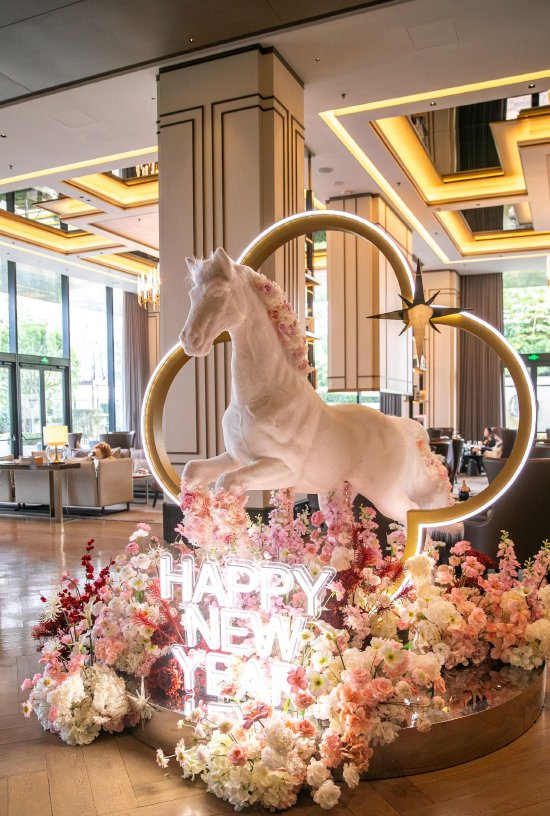 各功能分区美陈皆藏巧思:大堂吧女性向打卡装置,以白红为基、镜面为衬,缀以绒羽与花艺,暗合 “柔婉坚韧” 之姿,与精致下午茶的雅致调性相得益彰;水疗中心前台花艺宝瓶造型,取 “宝瓶纳福” 之意,简约清雅,契合疗愈空间的静谧禅心;中餐厅与自助餐厅的玻璃上,印 “福” 字与古体 “骐骥” 纹样,让佳肴与年味相融,尽显 “食礼合一” 的东方传统。