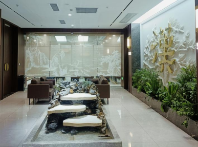 走进邮储银行汉中市分行财富中心,迎面而来的汉阙屏风庄重典雅,其上镂刻的纹路似在诉说汉中与汉文化的深厚渊源。屏风后隐约可见微型山水布景,潺潺流水与暖光相映,增添几分灵动与静谧。视线所及,展架上仿汉摆件错落有致,侧面墙体白色枝丫似文化根系,鎏金“漢”字居于其间,彰显“以汉韵润服务”初心。厅堂深处,木质斗拱层层叠叠,复刻汉代建筑的气韵,大理石墙鎏金题字熠熠生辉,细节之处皆可见“两汉三国”的文化符号。