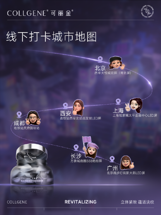 3月1日至3月8日,可丽金胶原膜王代言人金靖,点亮全国6城10屏。在北京、上海、广州、长沙、西安、成都共六座城市的核心地标中[3],十块光影交错的屏幕,共同定格那一抹“向上”的身影。品牌以此礼敬当代女性的向上精神,愿每一位路过抬头的人,都能在匆匆步履间,与这份力量不期而遇。