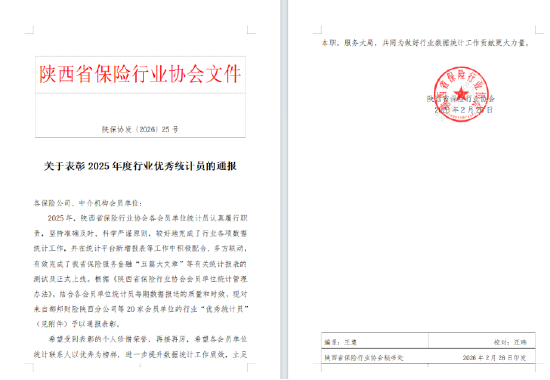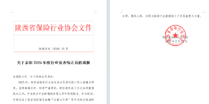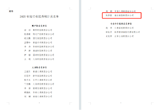 关注这几日,陕西省保险行业协会发布通报,表彰 2025 年度行业优秀统计员的通报,20名从业者获此殊荣。其中,瑞众人寿保险有限责任公司陕西分公司市场企划处的陈梦晨凭借准确高效的工作态度获得表彰。