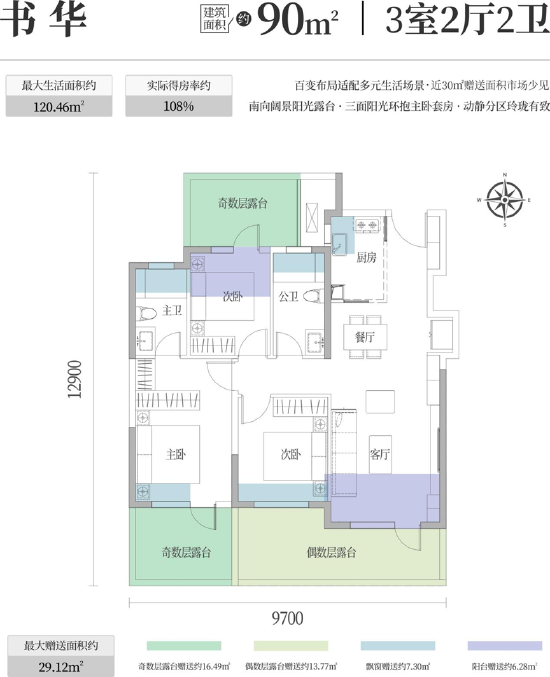 建筑面积约90㎡户型享约 6.5 米贯通露台、约 30㎡赠送,实得空间堪比 120㎡,全明双卫设计,满足三口之家成长需求。