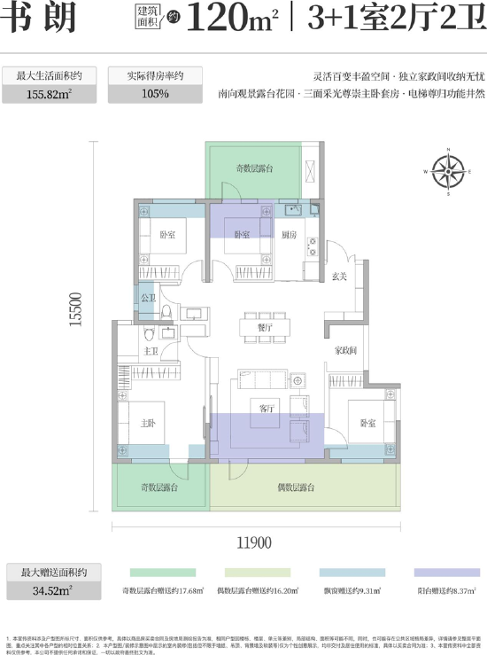 户型革新:臻四代产品,户户有露台(露台不计入产权面积,使用权以商品房买卖合同约定为准)