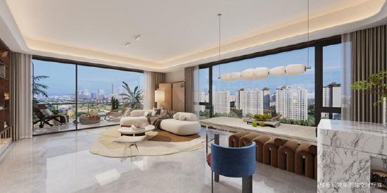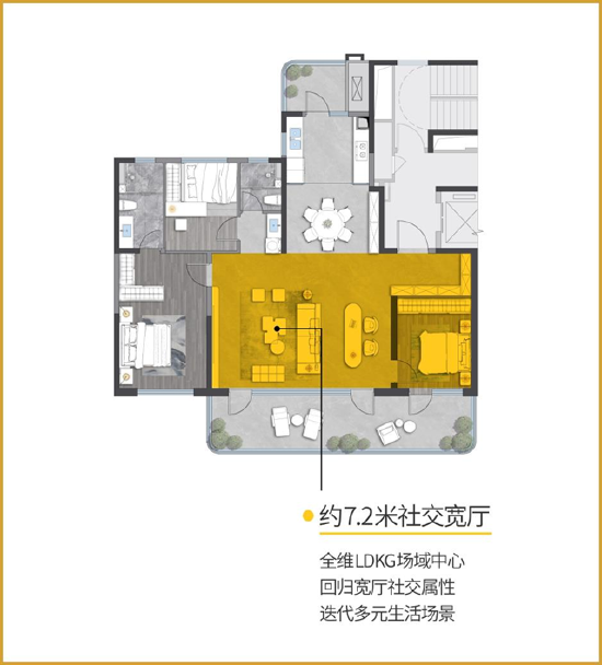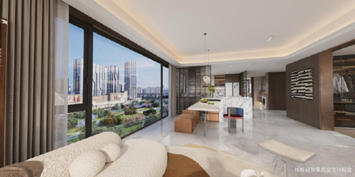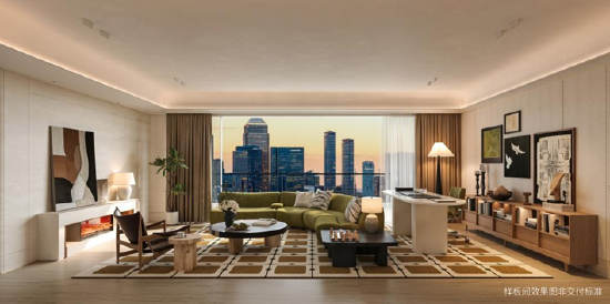 约7.2米豪华观景宽厅与LDKG一体化设计融合,打破传统客厅的功能局限——朋友聚会时可摆放8人长桌,孩子生日派对时能容纳游乐设施与亲友,即便三代人同时在公区活动,也不会显得拥挤;电梯入户的设计带来双重归家仪式,进门后可先在玄关换下外套、放下钥匙,再步入室内,避免外界灰尘带入,主城生活的精致感由此凸显;南北双露台化身“空中庭院”,南侧露台直面社区园林,晨起推窗可见,北侧露台可眺望城市风景,傍晚与家人在此喝茶聊天,惬意十足;客厅超尺度采光面,正午时分阳光可铺满整个客厅,让主城家庭的日常,始终与阳光、风景相伴。